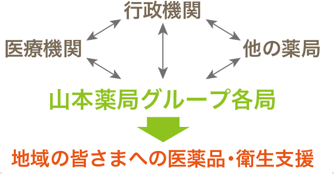 山本薬局はグループ全ての薬局にて、災害や新興感染症の発生時、行政機関・医療機関・他の薬局等との連携による、医薬品の供給や地域の衛生管理に係る対応を行う地域支援体制を確保しています。
